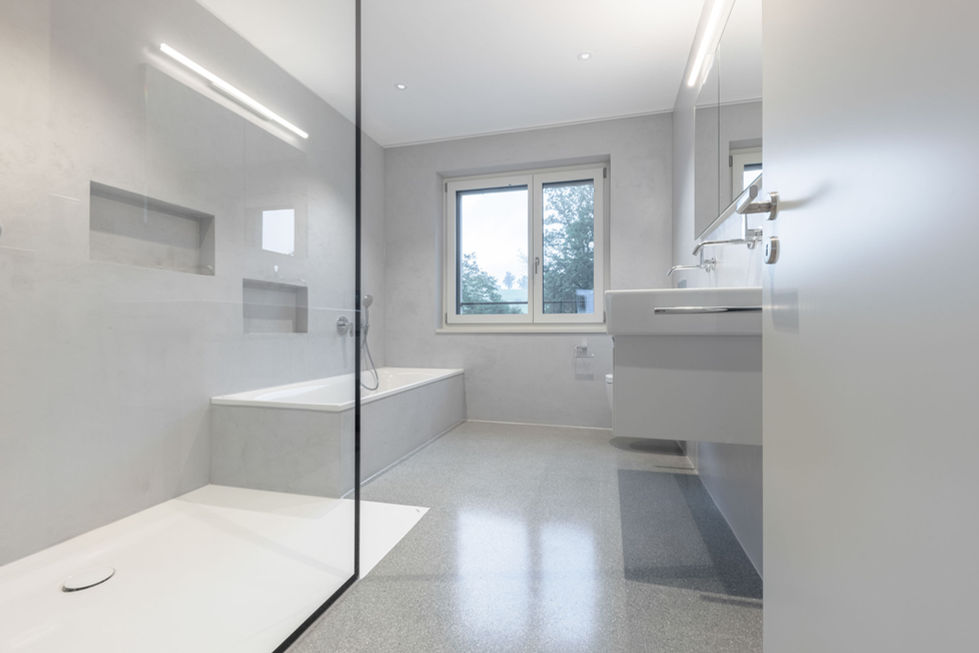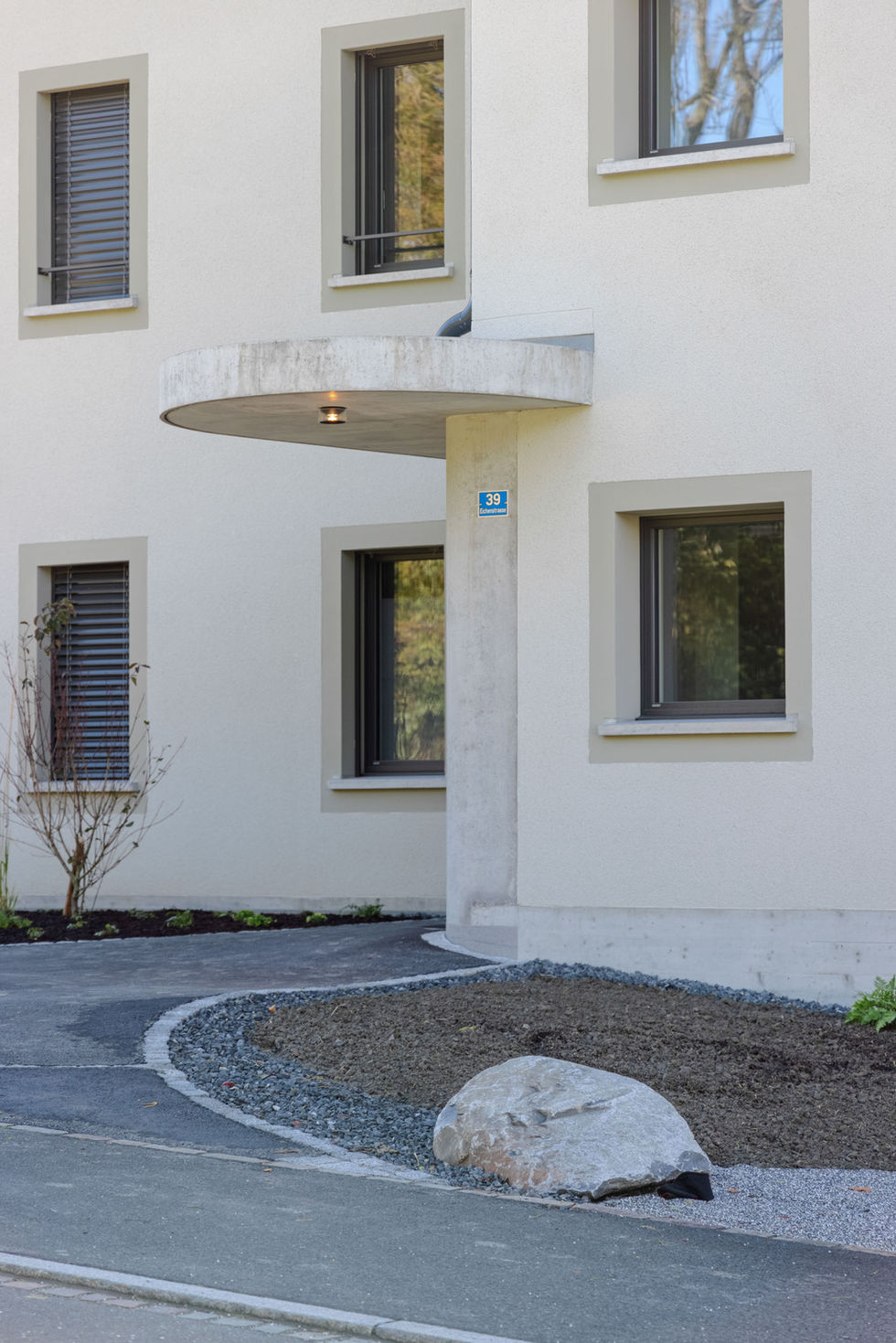 MEHRFAMILIENHAUS MIT 6 WOHNEINHEITEN. MASSIVBAU MIT AUSSENHÜLLE AUS EINSTEINMAUERWERK UND KRATZPUTZ. LOGGIAVORBAU MONOLITHISCH SICHTBETON.