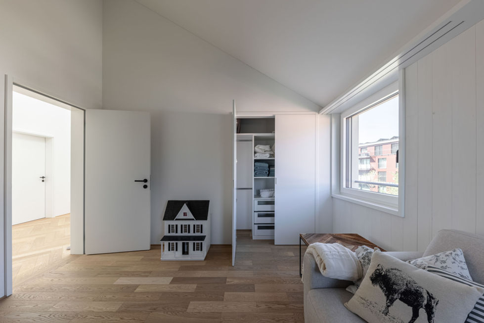 EINFAMILIENHAUS AUS HOLZ. AUSSENWÄNDE AUS MASSIVEN, LEIMFREIEN HOLZELEMENTEN. SOCKEL UND TREPPENHAUS BRETTERSCHALUNG SICHTBETON, FASSADE STÜLPSCHALUNG MIT SCHLAMMFARBE BEHANDELT.